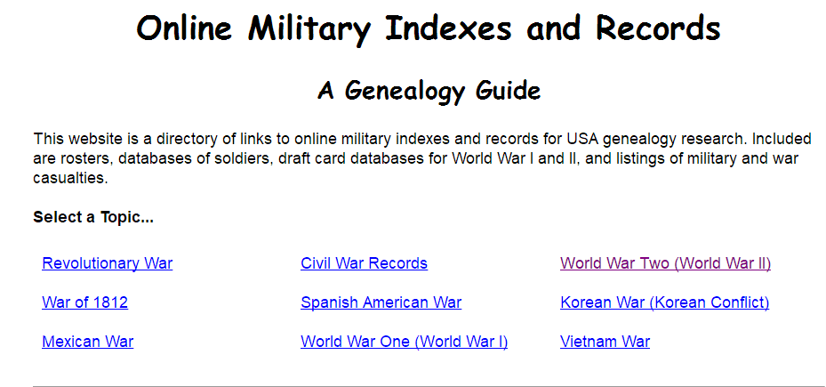 This website is a directory of links to online military indexes and records for USA genealogy research. Included are rosters, databases of soldiers, draft card databases for World War I and II, and listings of military and war casualties.