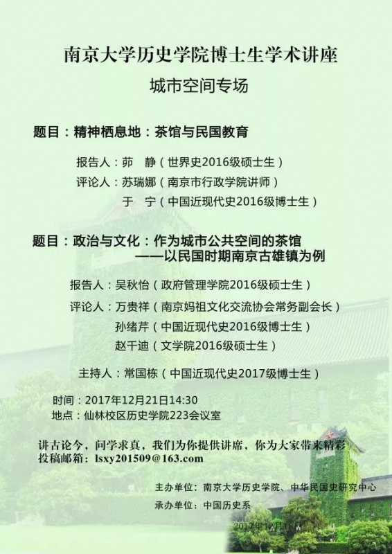 南京大學(xué)歷史學(xué)院、民國史中心博士生學(xué)術(shù)講座之城市空間專場