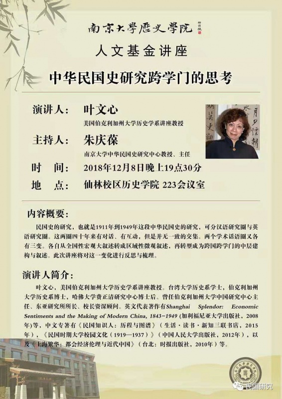 【講座】(美)葉文心:中華民國(guó)史研究跨學(xué)門的思考